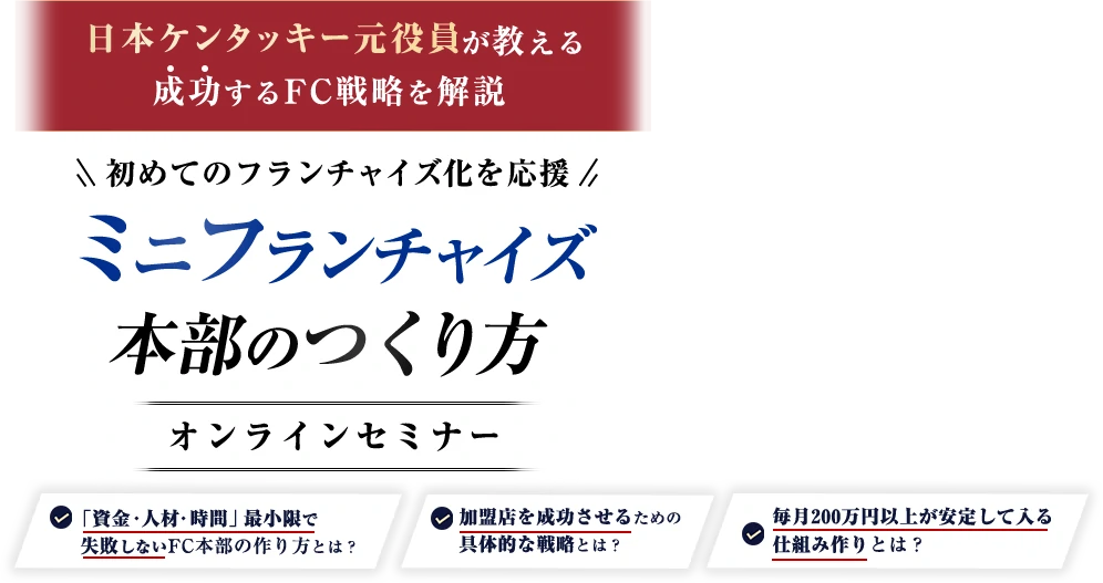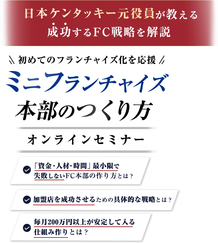 何か契約を勧められますか? - そのようなことはありません。ミニフランチャイズ本部の作り方と成功ノウハウをお伝えすることが目的です。無理に契約を迫るようなことは一切ございません。ご自身で判断していただくための情報提供の場としてご活用ください。ただし、FC化を検討されるのであれば、早めの行動をおすすめします。